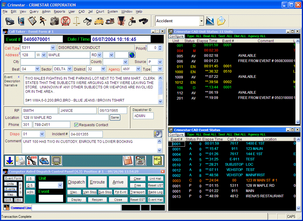 The Crimestar CAD system is comprised of a minimum of four primary forms or windows. These windows are the CAD Control Panel, Event Form, Unit Status Monitor Form and Event Status Monitor Form. These windows are used in conjunctions with one another to control all active and pending calls for service as well as maintain the status of each field resource. While you may have multiple Event Forms and Status Monitors simultaneously active you may only have one (1) CAD Control Panel active. The following sections describe the various forms and their respective features or uses.
