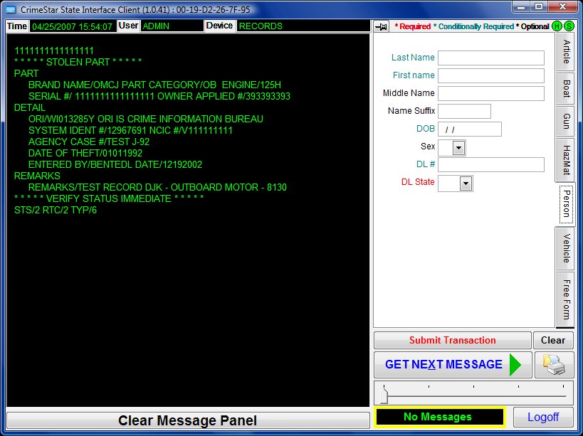 Even when the interface client is run as an integrated part of the Crimestar RMS work environment, it remains a top-level form on the Windows desktop with its own taskbar icon so that users can be alerted to inbound messages. Crimestar CAD seamlessly interacts and communicates with it to automatically and instantly submits transactions. CAD will submit a state/NCIC vehicle transaction whenever a Vehicle Stop command is issued (and license plate information is provided); and state/NCIC person transactions whenever a subject stop command is issued (and person name and date of birth information is provided).